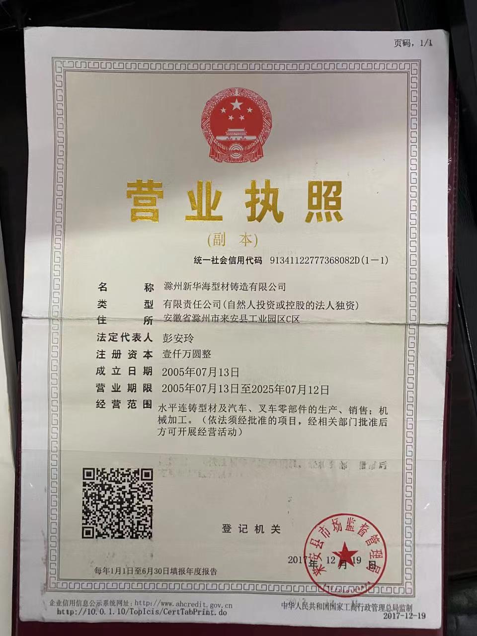 滁州新華海型材鑄造有限公司成立于2005年07月13日,注冊(cè)地位于安徽省滁州市來(lái)安縣工業(yè)園區(qū)C區(qū),法定代表人為彭安玲。 經(jīng)營(yíng)范圍包括水平連鑄型材及汽車(chē)、叉車(chē)零部件的生產(chǎn)、銷(xiāo)售;機(jī)械加工。公司自成立以來(lái),始終堅(jiān)持可持續(xù)穩(wěn)定發(fā)展道路,采用專(zhuān)業(yè)的技術(shù)、 不斷提升創(chuàng)新,打造高品質(zhì)產(chǎn)品,同時(shí)推進(jìn)技術(shù)創(chuàng)新和管理創(chuàng)新,形成了以企業(yè)為主的創(chuàng)新體系及運(yùn)行機(jī)制,確保了產(chǎn)品的順利開(kāi)發(fā)和后續(xù)升級(jí)。